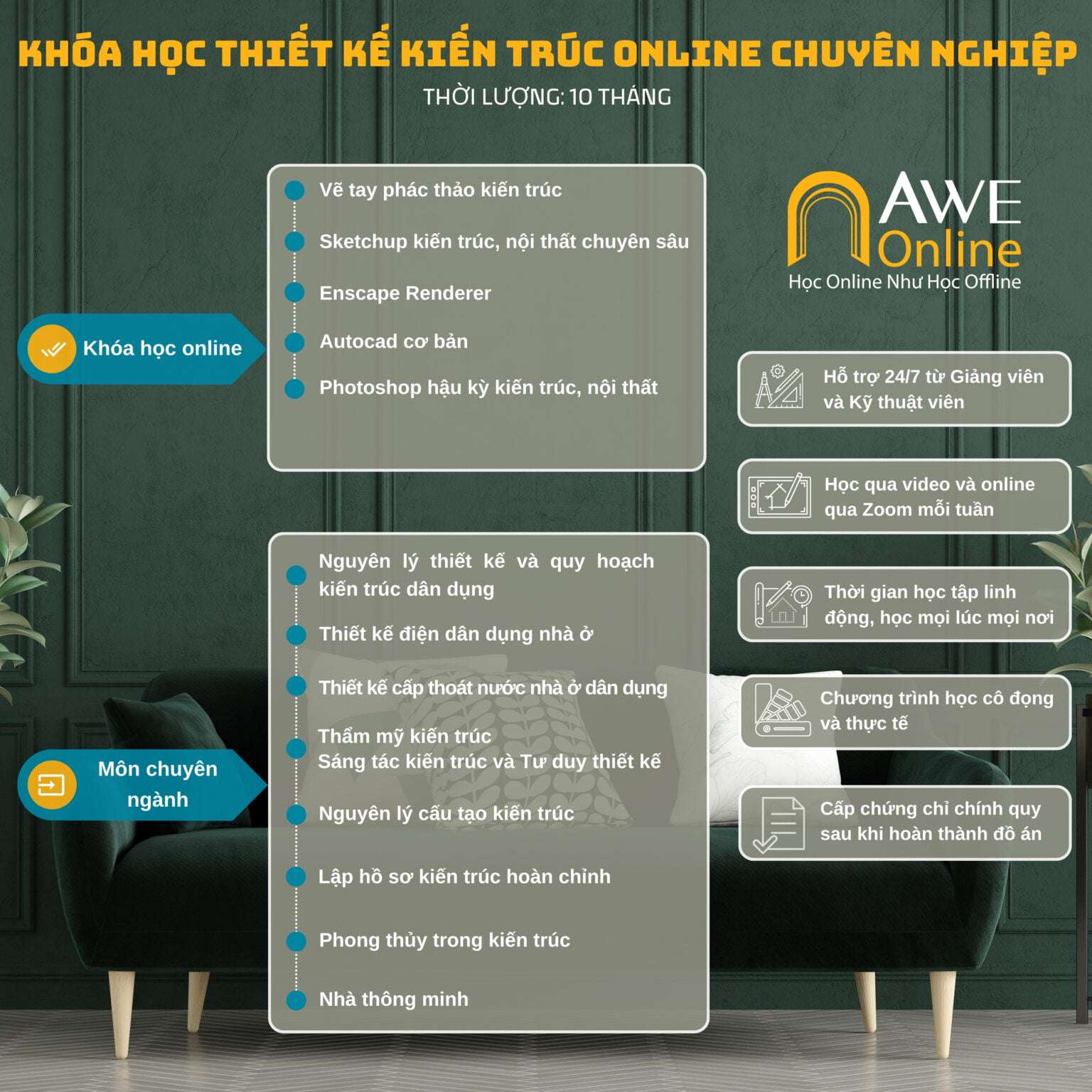 Khóa học này cung cấp kiến thức tương đương với khóa học trực tiếp kéo dài 10 tháng tại Trường dạy nghề NỘI THẤT, được giảng dạy trực tuyến thông qua nền tảng Zoom. Chúng tôi cam kết mang đến cho bạn trải nghiệm học tập tốt nhất, xóa bỏ khoảng cách giữa học trực tuyến và trực tiếp.